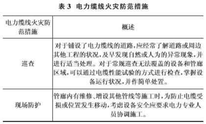 ⑥電力纜線在施工時采用明火引起的火災。通過對綜合管廊電力纜線火災危險性的分析,需要對電力纜線做好維護與管理工作,防范電力電纜火災的發生,防范措施如表3所示。