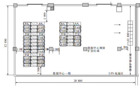 某煤礦模塊化數據中心的平面配置如圖 1 所示,某煤礦數據中心實景如圖 2 所示。 某煤礦數據中心共采購兩組 IDS 2000 雙 排模塊化數據中心,西側模塊數據中心包含一體化配電柜、行間空調、UPS 電源、雙回路電源輸入柜、UPS 電源輸出柜、空調電源柜,東側模塊數據中心包括配電柜、行間空調、中控、監控和 ODF 配線柜,其中還在數據中心機房預留有擴容區域。