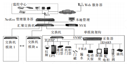 微模塊數據中心的機房管理采用 NetEco 基礎設施管理系統,此系統由管理軟件和其他部件構成,實現了對數據中心的溫濕度、空調系統、供配電系 統、UPS 后備電源、消防及監控等多系統的數據采集與監控,將各子系統和分散環節集中統一管理,為智 能化微模塊數據中心的全系統監控提供了可靠保 障。NetEco 管理系統架構圖如圖3 所示。
