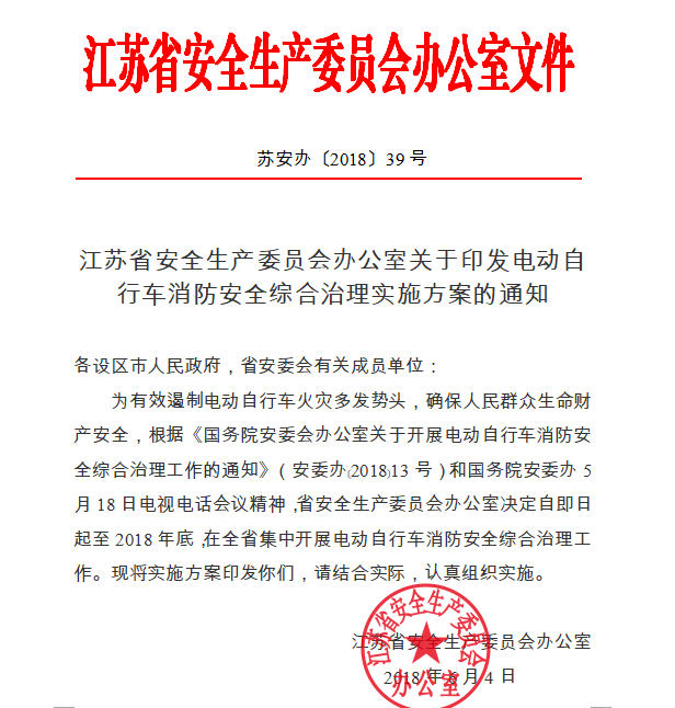 2018515日國(guó)務(wù)院發(fā)布《國(guó)務(wù)院安委會(huì)辦公室關(guān)于開(kāi)展電動(dòng)自行車消防安全綜合治理工作的通知》開(kāi)展電動(dòng)自行車消防安全綜合治理工作。